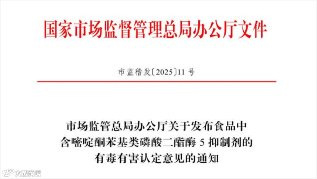 标 题:市场监管总局办公厅关于发布食品中含嘧啶酮苯基类磷酸二酯酶5抑制剂的有毒有害认定意见的通知