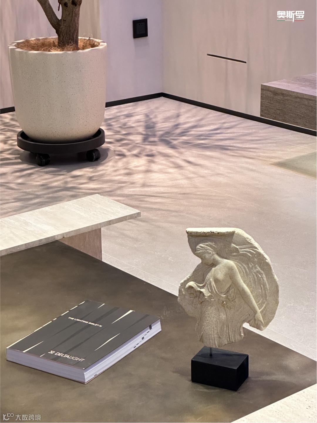 而展厅一隅的休憩区,玛勒莫涂料则以温柔质感消解了科技的冷峻。暖灰色的玛勒莫墙面,搭配木质长桌与艺术雕塑,涂料的细腻触感与木质的温润、雕塑的厚重形成质感互补,光线透过格栅洒在墙面上,玛勒莫的肌理让光影变得柔和而富有层次,这里既是智能科技展示的延伸,也是人们驻足交流、感受空间温度的角落,完美诠释了 “科技以人为本” 的内核。