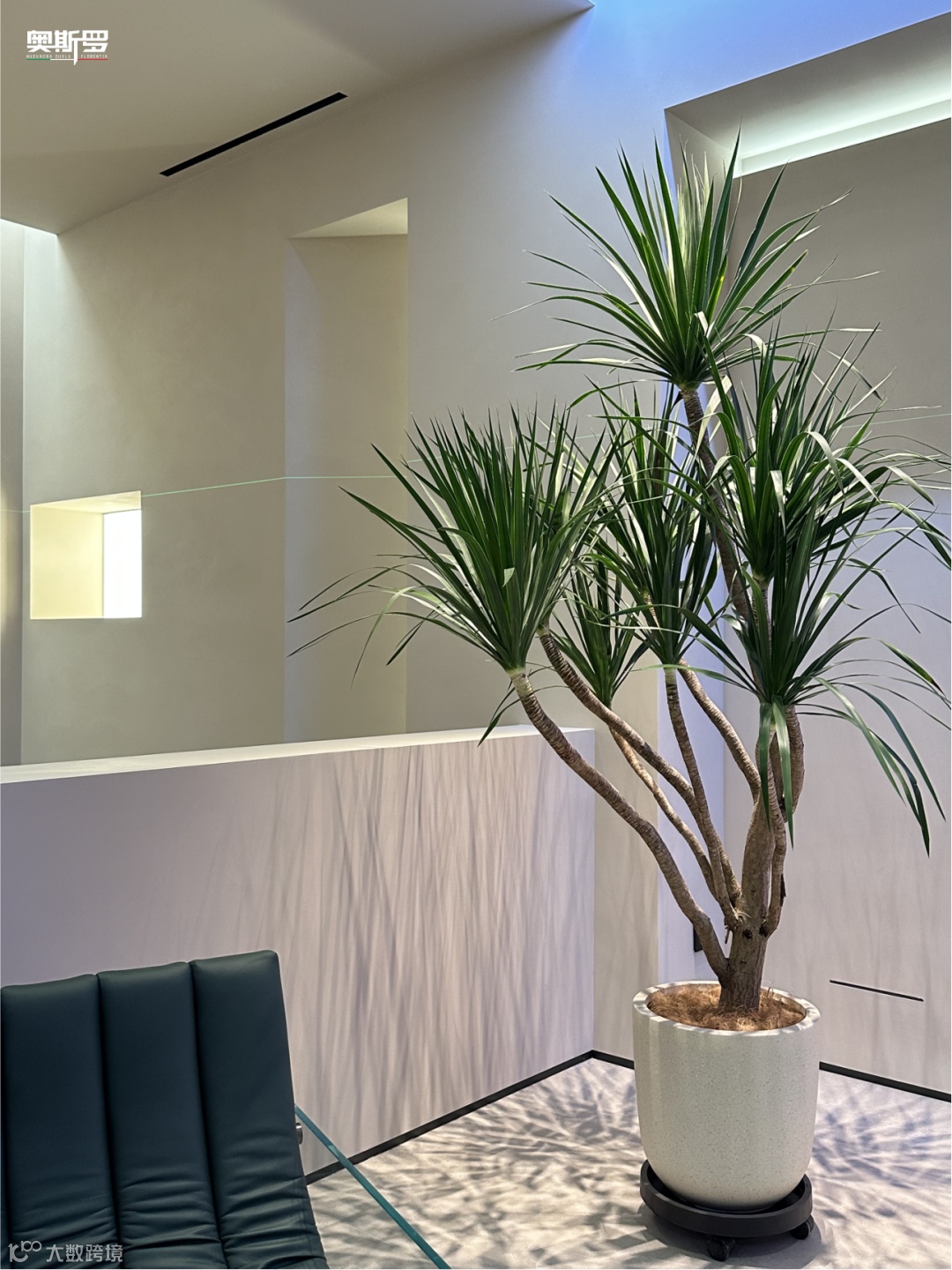 转身遇见的艺术造景区,是玛勒莫美学张力的极致表达。弧形墙面以玛勒莫涂料打造出流畅的渐变质感,从浅米到浅灰的过渡自然无痕,如同山城云雾在天际缓缓晕染,又似江水在峡谷中轻柔流转。墙面搭配绿植与艺术摆件,玛勒莫的细腻肌理与绿植的自然生机、摆件的复古质感相互映衬,冷硬的科技材质与温润的涂料质感中和,让空间既有智能展厅的现代感,又藏着山城生活的烟火气与艺术感。