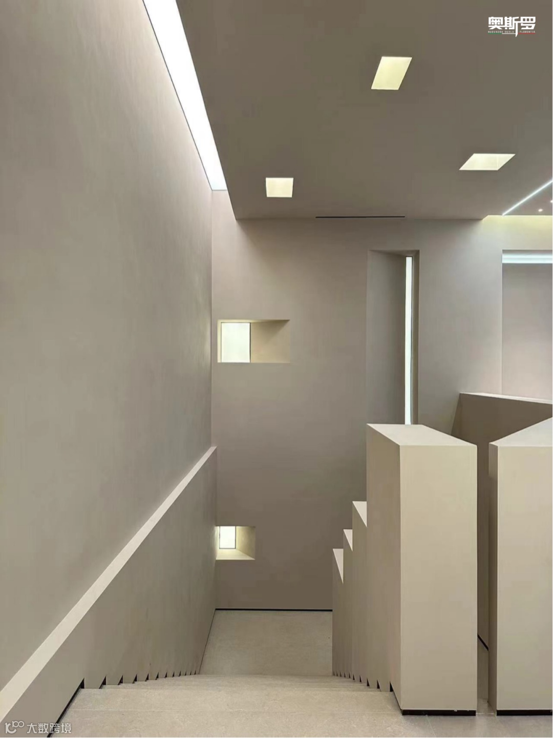 楼梯转角处的几何造型墙面,玛勒莫涂料以精准的施工工艺,将直线、棱角的硬朗感与涂料的柔和质感完美融合。棱角分明的设计本易显得生硬,却因玛勒莫的细腻包裹变得温润可亲,光线从嵌入式灯槽中透出,在玛勒莫墙面上投下错落的光影,几何线条与光影交织,让楼梯通道不再是单纯的通行区域,而是成为空间中极具设计感的视觉节点。