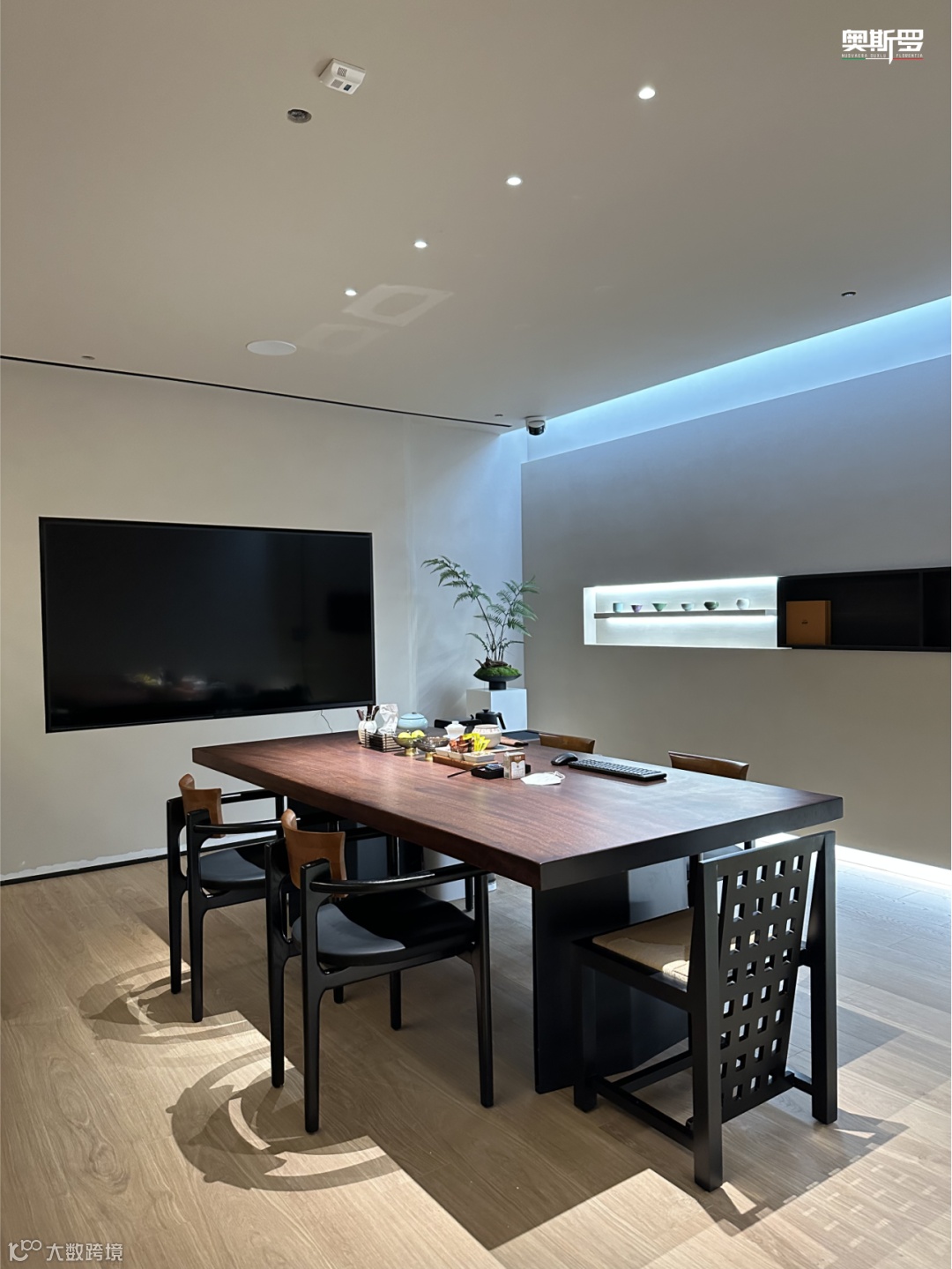 前行至核心展示区,玛勒莫的色彩表现力尽显无遗。暖调的浅咖与浅灰交织,与展厅内的木质家具、石材台面自然相融,既呼应了重庆山城的大地色系,又契合了智能科技追求的简约高级。光线漫过墙面,玛勒莫涂料的细腻质地让光线均匀铺展,无刺眼反光,亦无斑驳痕迹,柔和的光影在墙面上流转,勾勒出空间的轮廓与细节。当智能灯光系统缓缓切换色调,玛勒莫墙面又展现出灵动的光影互动 —— 冷调蓝光掠过,墙面似覆上一层静谧的冰雾,与智能设备的科技感相得益彰;暖调橙光漫溢,墙面又晕染出温润的暖意,消解了科技空间的疏离感,让人与空间、科技达成温柔共鸣。