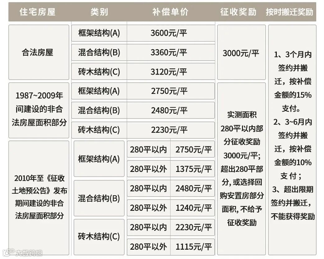 ● 按时搬迁奖励:在基础补偿+征收奖励基础上,额外叠加15%(如框架结构为990元/平方米)