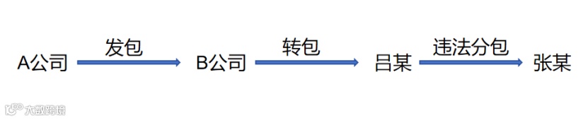 上述新建工司法解释一第四十三条第二款的规定内容,存在三方当事人,两层法律关系。一是承包人与发包人之间的建设工程施工合同关系;二是承包人作为转包人或者违法分包人与转包或者违法分包中的承包人之间的转包或违法分包关系。本案中,存在四方当事人,三层法律关系,除以上两层法律关系外,还有吕某违法将案涉项目肢解交给张某来承包的违法分包关系,具体如下图所示: