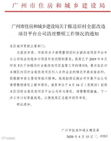 2020年4月15日,广州市住房和城乡建设局向各区城市更新主管部门发布《广州市住房和城乡建设局关于报送旧村全面改造项目平台公司清理整顿工作情况的通知》,通知中提到为落实市委、市政府关于清理整顿旧村全面改造项目平台中介公司违法违规参与项目开发问题的要求,广州市住房和城乡建设局已于2019年9月印发《关于加强旧村全面改造项目监管工作的通知》,要求各区对本辖区内旧村全面改造项目引入合作企业的情况开展自查自纠。