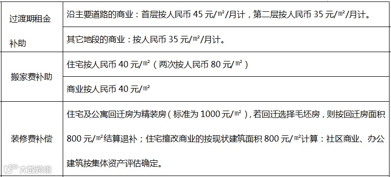 具体过渡期租金、搬家费、装修费补偿见表: