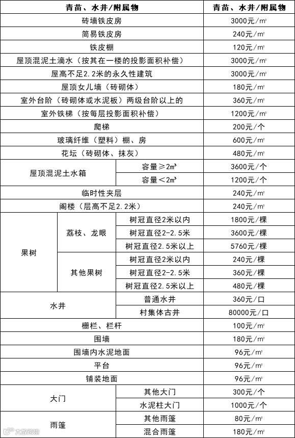青苗、附属物及其他附着物补偿方案见表: