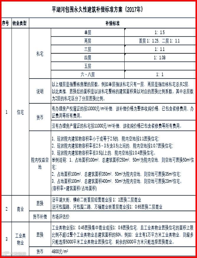永久性建筑物补偿方案见表: