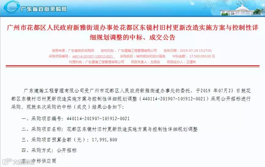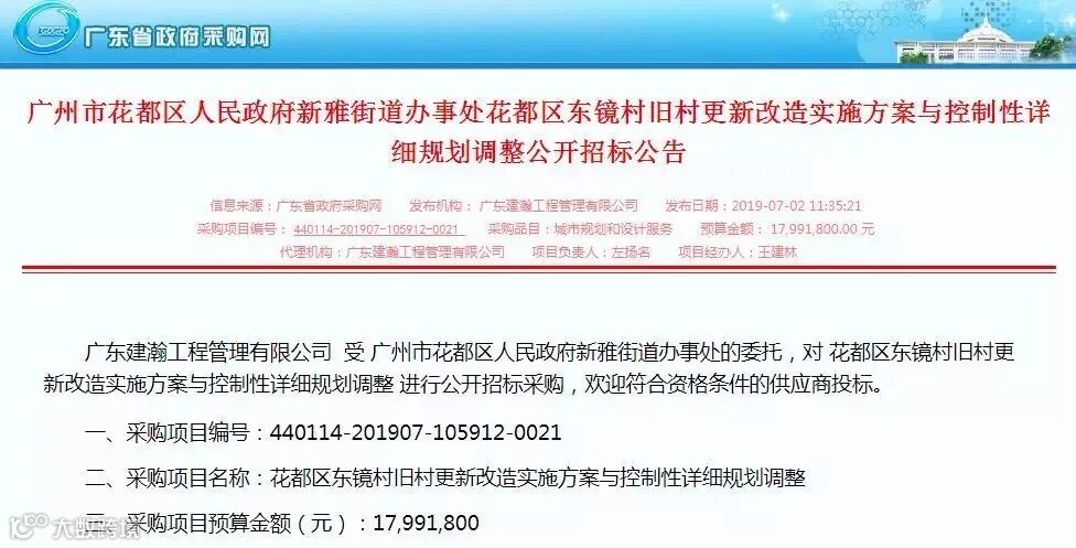 2019年7月2日,东镜村旧改实施方案与控制性详细规划调整公开招标。