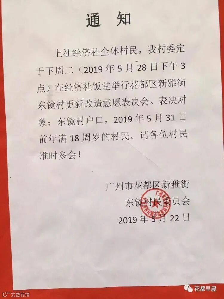 东镜村2019年5月28日,东镜村民委员举行更新改造意愿表决会,征求村民对于改造的意见。