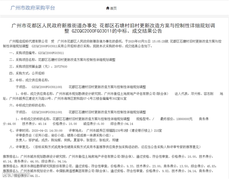 2020年4月,石塘村全面改造项目更新改造方案与控制性详细规划调整顺利完成招投标工作,并已在广州市政府采购网进行公示。