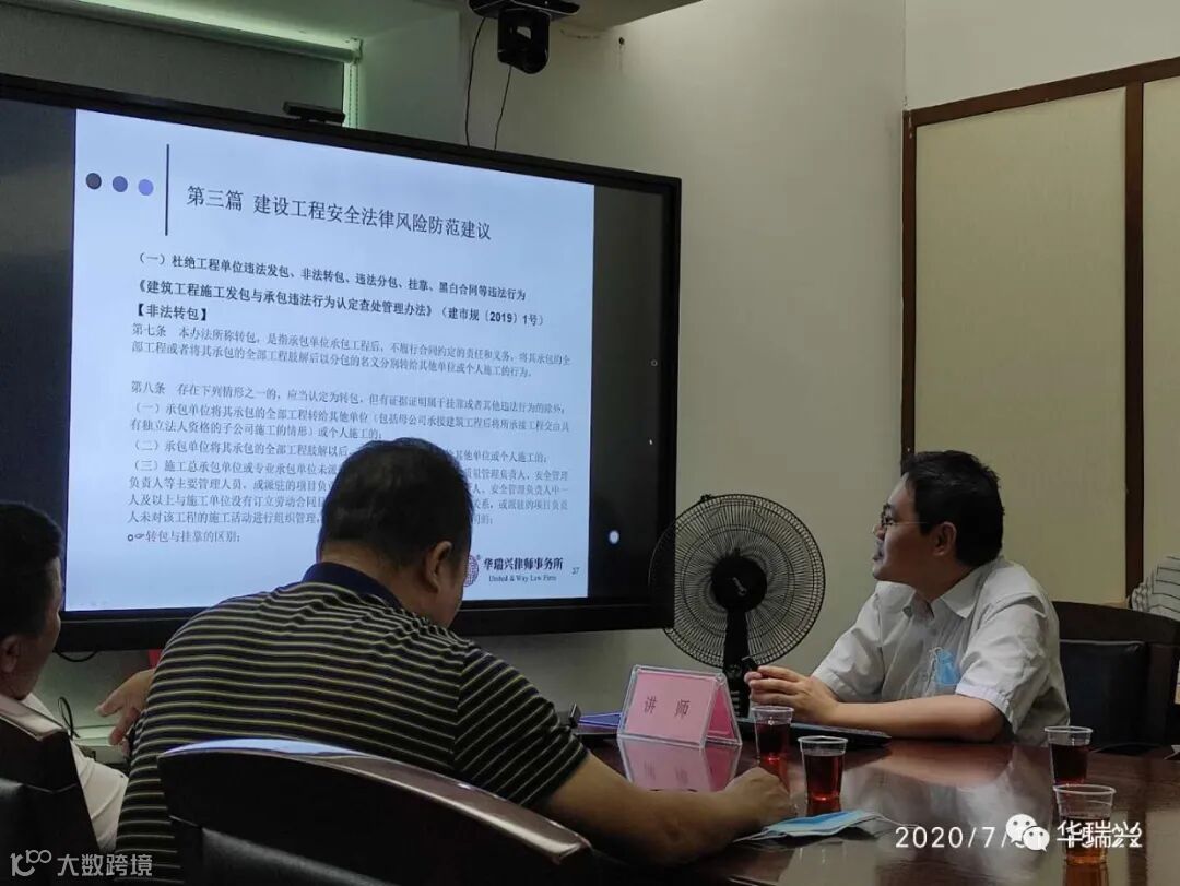 2020年7月31日,华瑞兴作为广州市恒嘉建设工程有限公司常年法律顾问受邀为广州市恒嘉建设工程有限公司公司中层及以上的管理人员进行主题为“施工企业风险防范”的法律知识培训讲座。