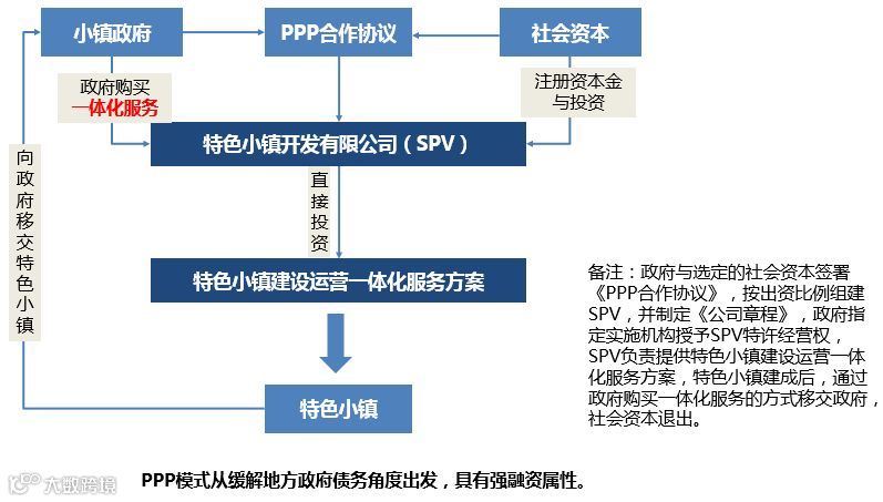 PPP模式从缓解地方政府债务角度出发,具有强融资属性。在特色小镇的开发过程中,政府与选定的社会资本签署《PPP合作协议》,按出资比例组建SPV,并制定《公司章程》,政府指定实施机构授予SPV特许经营权,SPV负责提供特色小镇建设运营一体化服务方案,特色小镇建成后,通过政府购买一体化服务的方式移交政府,社会资本退出。