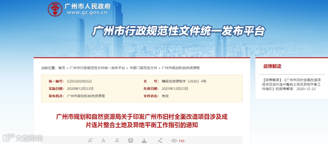 12月23日,广州市规划和自然资源局印发《广州市旧村全面改造项目涉及成片连片整合土地及异地平衡工作指引》。