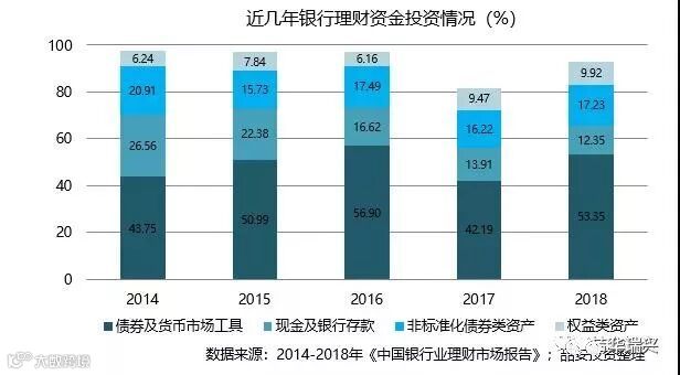 截至2018年底,非保本理财资金投向存款、债券及货币市场工具的余额占非保本理财产品投资余额的65.70%。其中,债券资产配置比例在理财资金投资的资产中占比最高,为53.35%。