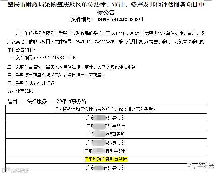 2017年3月10日,华瑞兴律师事务所参加“肇庆市财政局采购肇庆地区单位法律、审计、资产及其他评估服务项目(子包1:律师事务所)”的公开招投标,经过评标委员会专家组的评审,于2016年12月16日成功中标该项目。