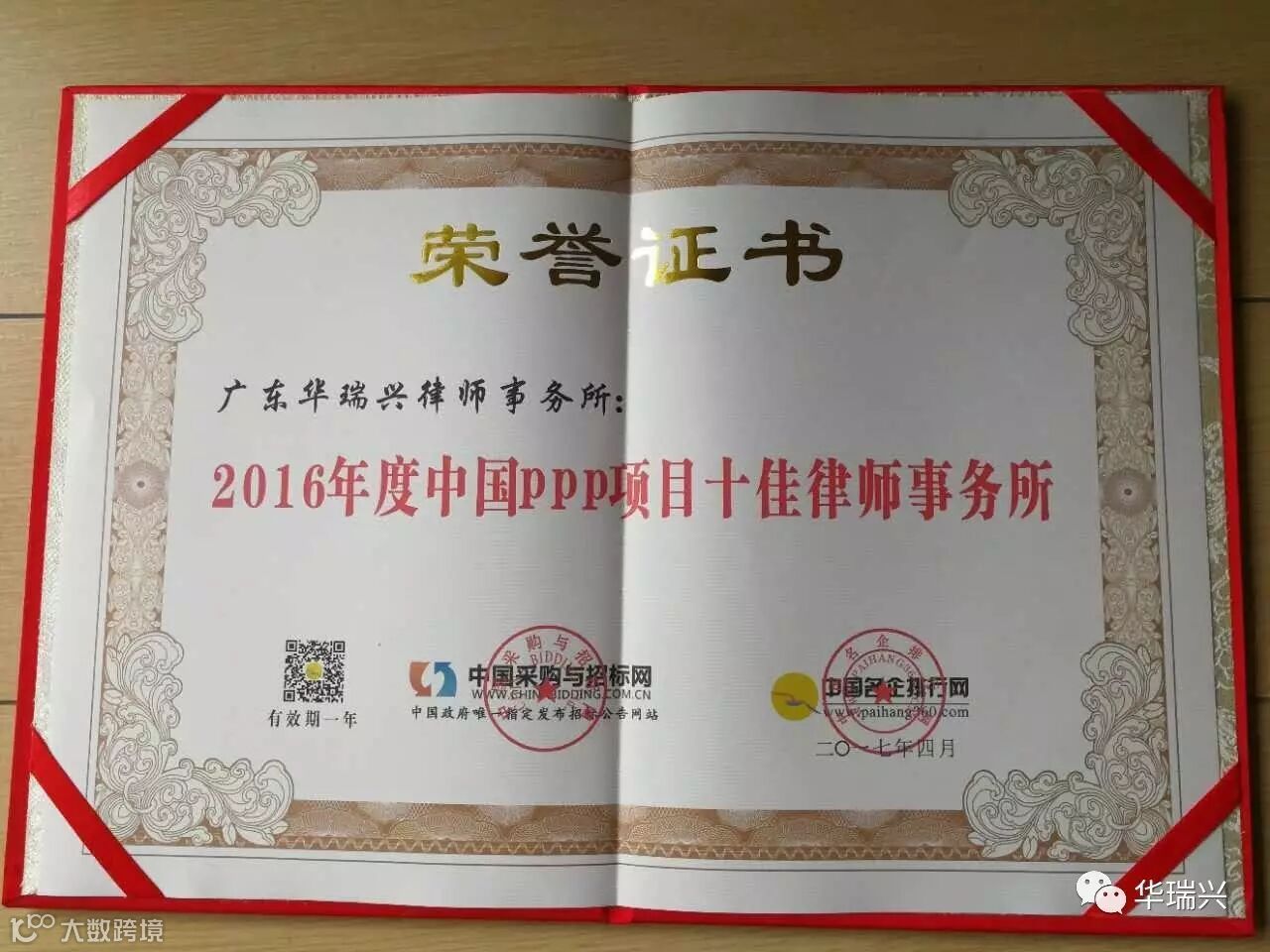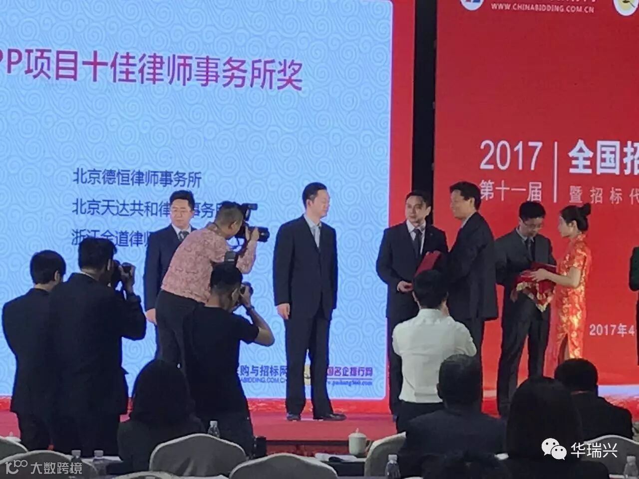 2017年4月25日,国家发改委四号令授权中国政府唯一指定发布招标公告网站中国采购与招标网、中国第一个专业招标采购评价网站中国名企排行网特联合主办“2017第11届全国招投标领域年度聚焦颁奖典礼暨创新论坛”于在北京新疆大厦隆重举办。华瑞兴律师事务所荣获“2016年度中国PPP项目十佳律师事务所”称号并受邀参加颁奖典礼。此前,中国采购与招标网、中国名企排行网已联合主办“2017第11届全国招投标领域年度聚焦暨招标代理、PPP咨询服务机构评价推介”活动,在业内及社会上产生巨大反响,年度聚焦专题中832家企业、362位个人共获3417万人次关注、681万个有效点赞、7000多条评论,该聚焦活动成为全国招投标领域参与更广、互动更多、影响更大的一件盛事。2016年度中国招标代理机构百强、中国PPP项目咨询服务机构百强、中国PPP项目十佳律师事务所等单位数百位领导出席了此次论坛,本次创新论坛成为全国招投标领域规模最大的一次峰会。