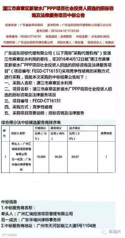 热烈祝贺广州汇瑞投资项目管理有限公司与华瑞兴律师事务所组成联合体参加“湛江市麻章区新坡水产PPP项目社会投资人招选的招投标咨询及法律服务项目”的竞争性磋商,经过评标委员会专家组的评审,成功中标该项目。