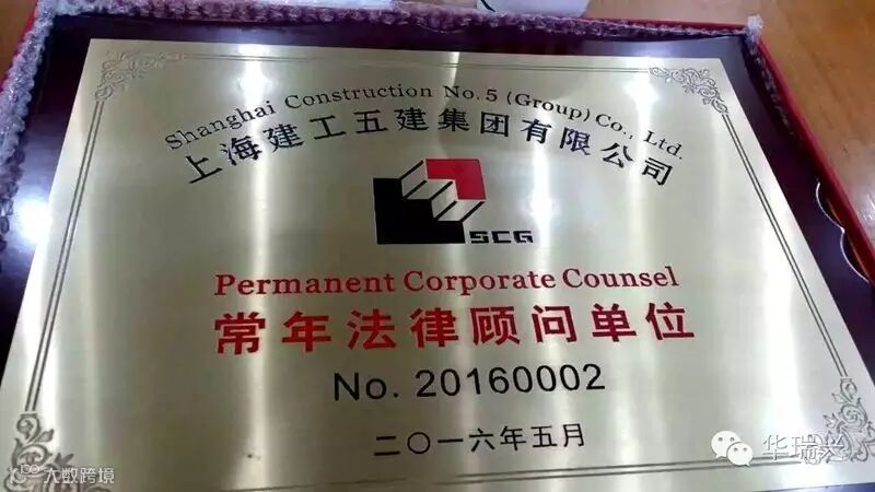 2016年6月3日,华瑞兴律师事务所被上海建工五建集团聘任为南方常年法律顾问单位,华瑞兴律师事务所管委会主任魏济民律师接受上海五建集团领导及上海建工集团法务部领导的授牌仪式并为上海五建集团进行《PPP项目涉及"营改增"的法律风险》的讲座。
