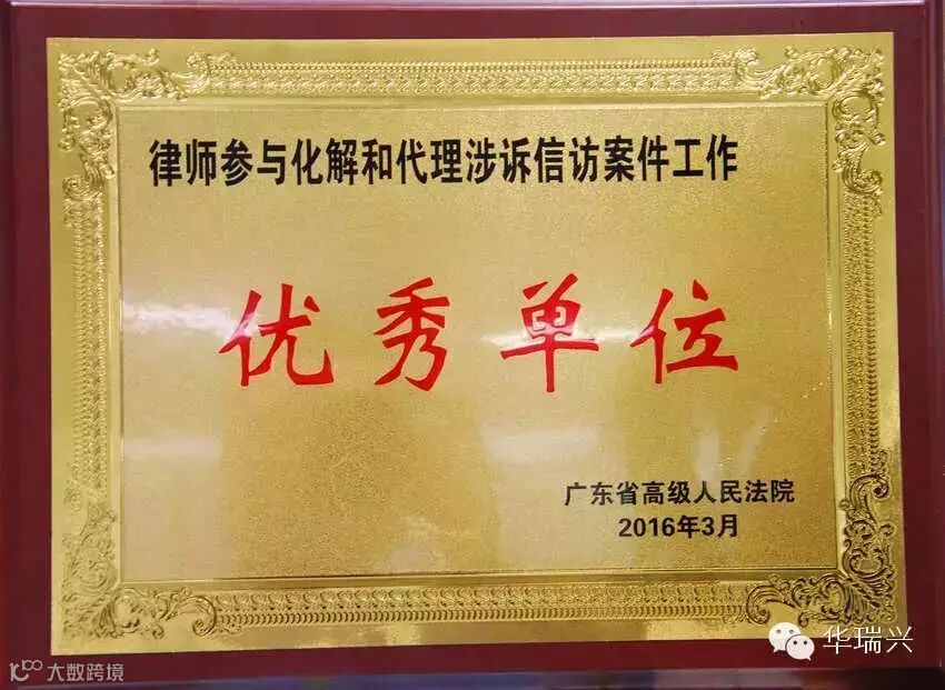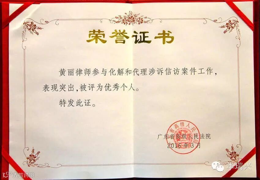 2016年3月17日,广东省高级人民法院在本院召开“律师参与涉诉信访案件化解工作阶段性总结座谈会”,对联盟前期工作做出总结及对优秀接访律师和律师事务所进行表彰。省法院凌祁漫常务副院长等有关领导及省政法委、省司法厅等领导出席讲话。在本次会议中,华瑞兴律师事务所荣获“律师参与化解和代理涉诉信访案件工作优秀单位”、黄丽律师在接访工作中表现突出,荣获“律师参与化解和代理涉诉信访案件工作优秀个人”。