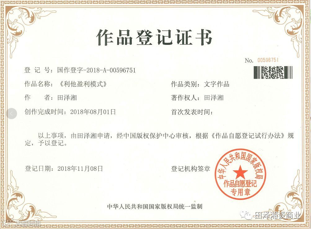 2018年:自主研发《利他盈利模式》、《利他招商模式》、《利他融资模式》、《多米诺商业系统》已申报中华人民共和国知识产权保护,并成为多家商学院首推课程。