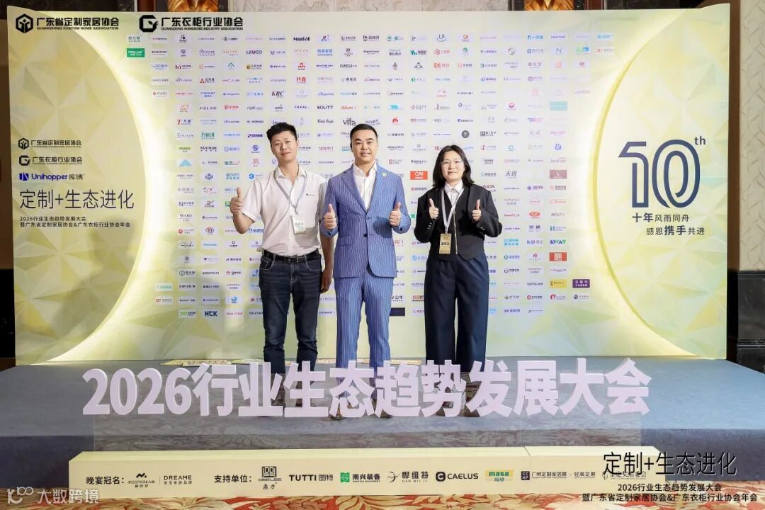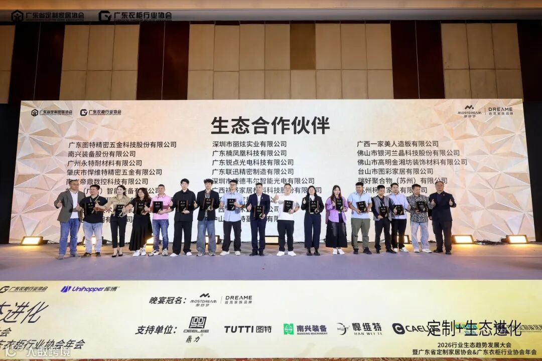 紧随其后,在“定制 + 生态进化”2026 行业生态趋势发展大会暨协会年会上,凯澳智能以核心支持单位身份亮相,进一步巩固了在定制家居智能制造领域的中坚地位,并荣获大会 “生态合作伙伴” 称号,获得行业高度认可。