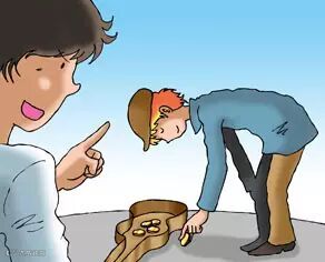 一个无赖鄙夷地将钱扔在青年男子的脚下。青年男子看了看无赖,弯下腰拾起地上的钱,递给无赖说:“先生,您的钱掉在了地上。”