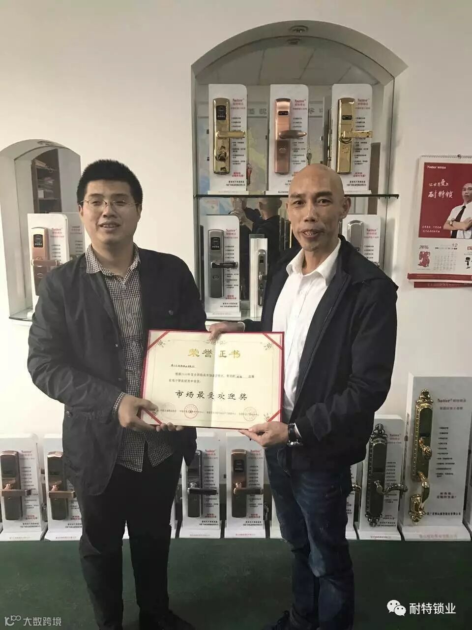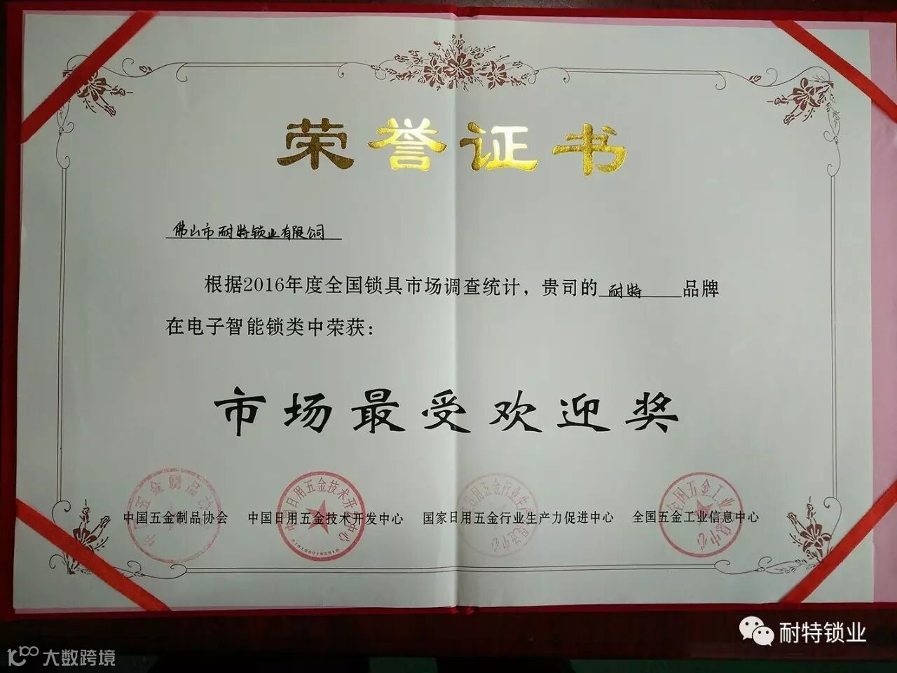 2016年12月12日由中国电子锁委员会主任、中国日用五金技术协会主任(赵宏武)先生,来到佛山市耐特锁业有限公司,亲手将《市场最受欢迎奖》荣誉证书交给耐特锁业董事长(吴昌胜)先生。