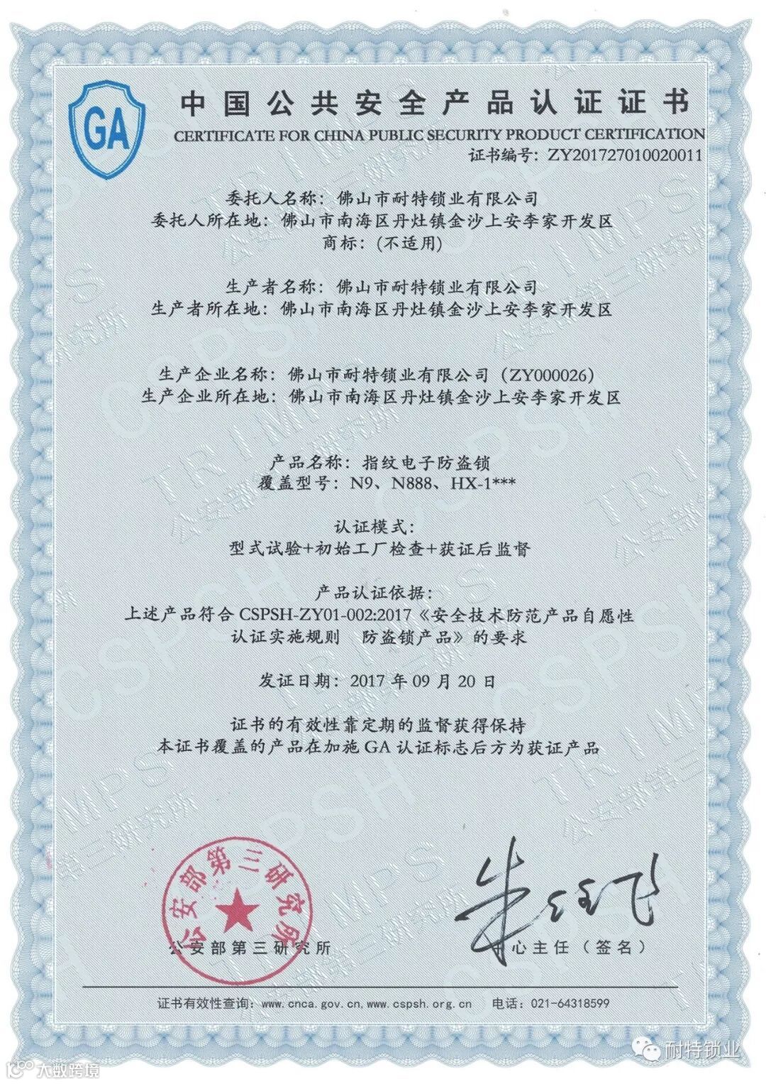 耐特指纹锁、全304不锈钢制造,安全防盗,经过公安部第三研究所严格测试,各项测试结果均达到GA合格标准,于2017年9月20日颁发中国公共安全产品认证证书(简称GA认证)。