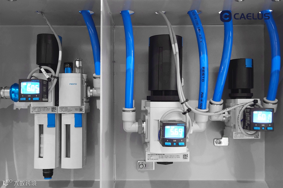 The machine is equipped with Festo's Filter- Regulator-Lubricator unit, a precision pressure regulator, hydrolysis-resistant hoses, and an electronic pressure gauge. This configuration ensures clean and stable air supply, with the regulator enabling precise control of air pressure. The hoses are designed to withstand harsh operating conditions, while the gauge provides real-time monitoring of pressure