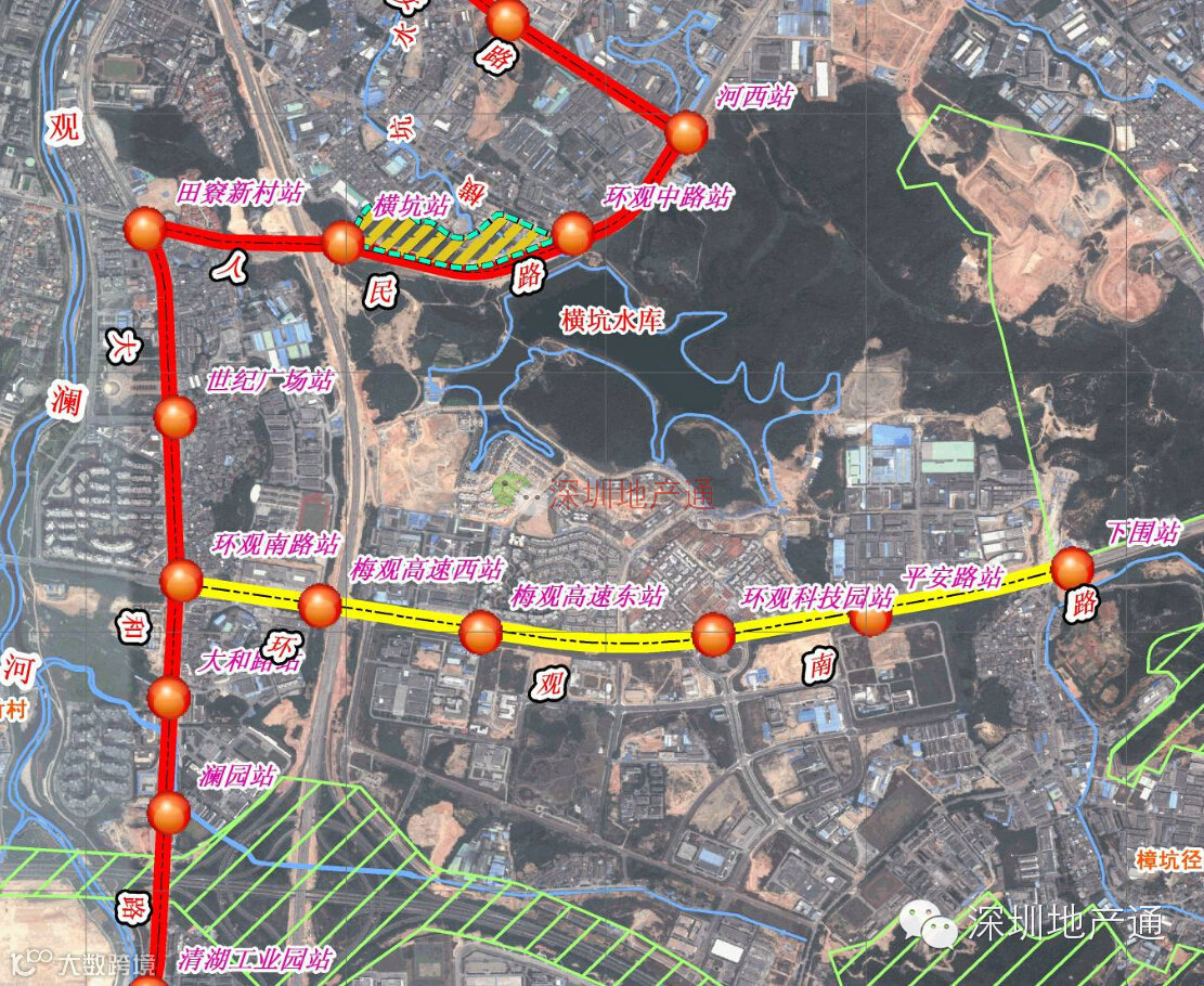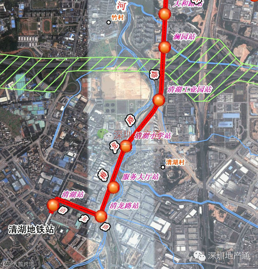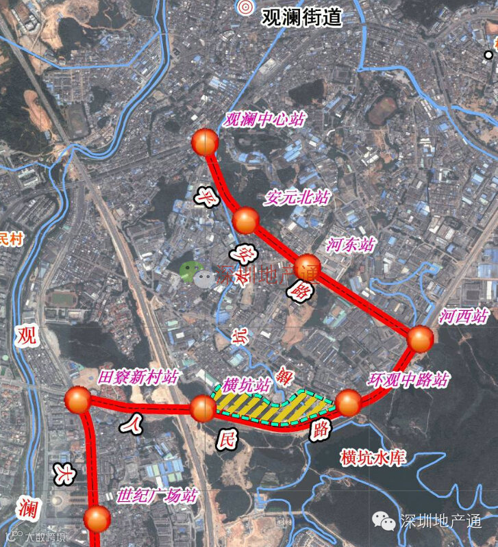 有轨电车主线在清华站至观澜中心站(南起和平路地铁清湖站北端,北至平安路与观澜大道交叉口)支线自主线环观南路站引出,经梅观高速、观澜科技园、平安路、下围至线路终点。