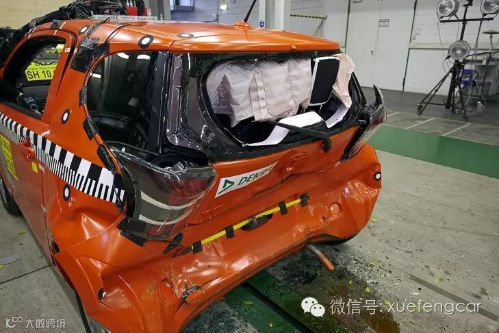 丰田IQ是比奇瑞QQ还小的一款微车,考虑到此车比较弱小,负责给它爆菊的是一款欧宝旅行轿车,追尾的时速也降低到32英里(大约51公里),结果,它后排乘员的情况比雷诺Grand Scenic还惨,除了头部和上身的损伤,腿也保不住了。