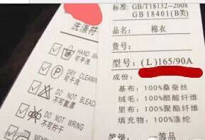 如果用L、M、X等来表示大小,则是不符合标准的。这样的产品只能告诉我们它的生产厂家不用心,质量上很难让人信赖。 合规的标注是使用号型标,如 “175/88A”。两个数字分别表示身高和胸腰围,后面的英文字母表示体型。在中国, A表示“正常”、B表示“偏胖”、C表示“胖”, Y表示“偏瘦”。