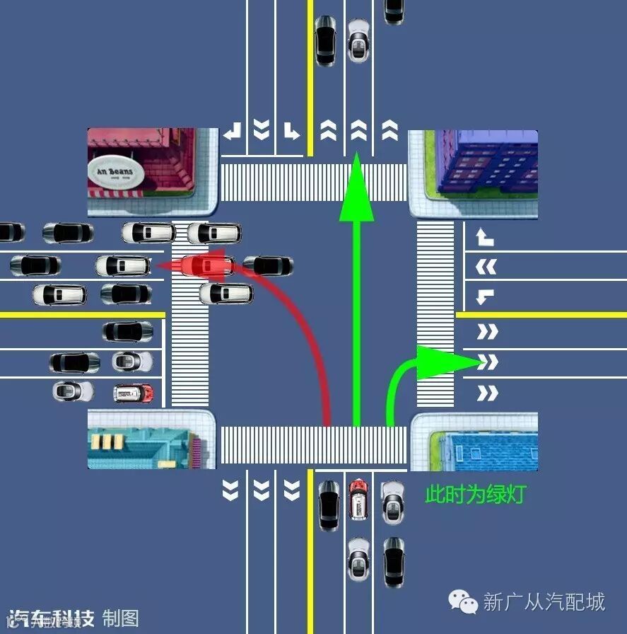 第2种常见的情况(如上图),当绿灯亮起时,左拐方向出现阻塞,那么左拐车流必须在路口外等待,而直行右拐的车流则可以正常绿灯行驶。