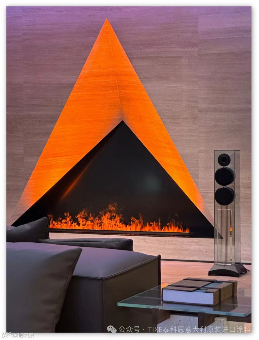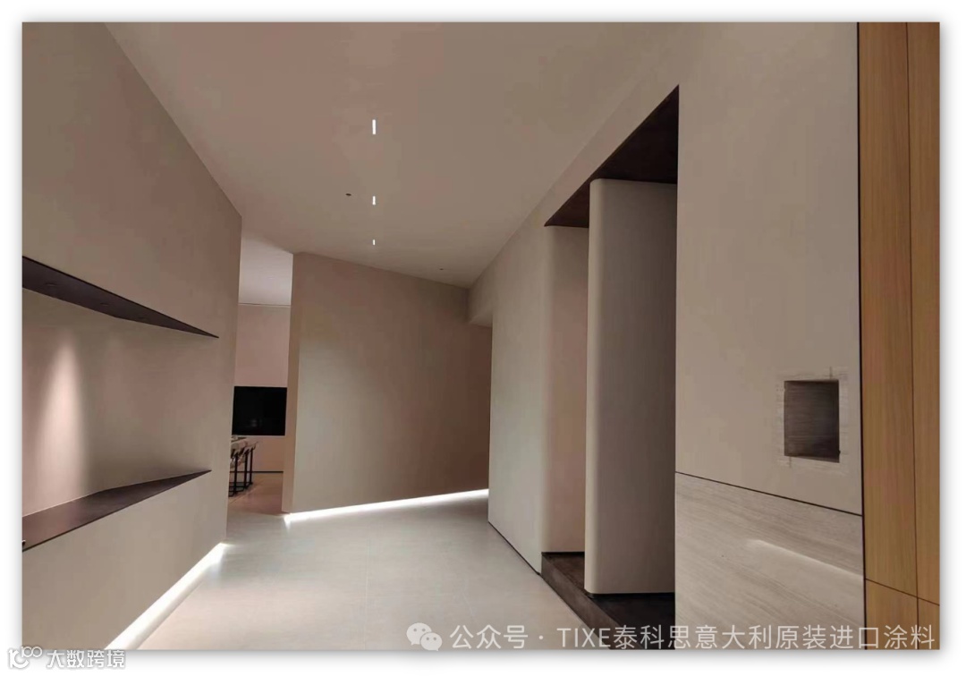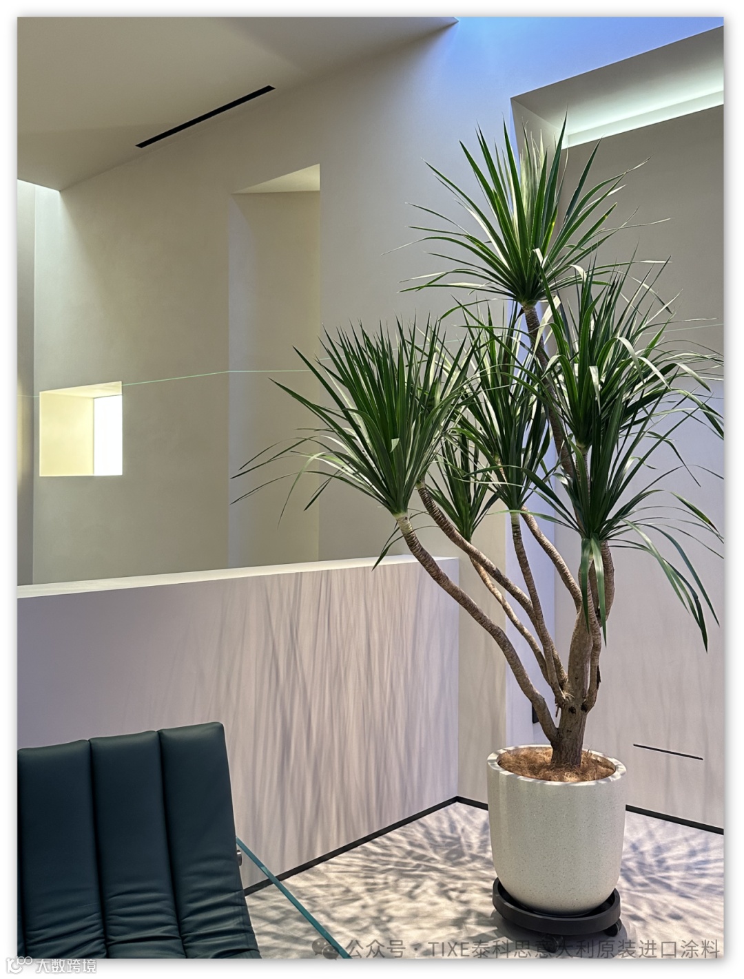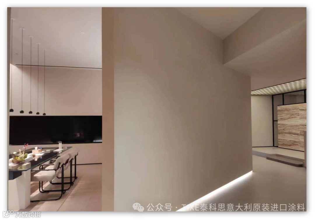 ②材质对比:涂料与家具、装饰品的材质形成了鲜明的对比,让空间的质感更加丰富多样。同时,这种对比也突出了艺术涂料在视觉上的独特魅力。