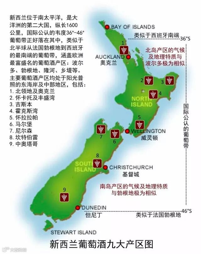 新西兰人爱酒之心,尽人皆知。大大小小的酒庄遍布郊外。新西兰的葡萄酒也越来越受到世人的欢迎。主要葡萄酒产区均处于阳光普照的东海岸及中部地区,这些地区均位于南半球纬度36度至46度之间,纵长1600公里。类似于北半球从法国勃艮第到西班牙最南端的葡萄带(涵盖欧洲最富盛名的葡萄酒产区:波尔多、勃艮第、隆河、乡堤等)。