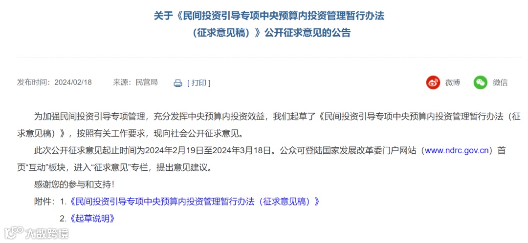 发改投资〔2023〕1004号文件明确提出“我委将调整设立中央预算内投资专项,每年选择20个民间投资增速快、占比高、活力强、措施实的地级市(区)予以支持”。为此,2024年拟设立中央预算内投资民间投资引导专项,发挥政府投资资金“四两拨千斤”作用,进一步鼓励、支持、引导民间投资发展。根据中央预算内投资管理规定,国家发展改革委拟以规范性文件将《办法》印发各地,用于规范项目和资金管理。