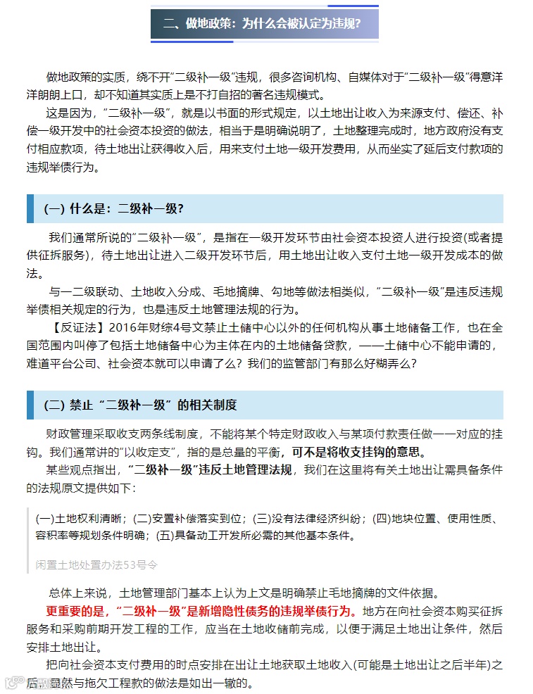 华瑞兴律师事务所点评认为:做地模式中指定国有做地主体融资参与做地项目,做地项目回报不直接与土地出让收入挂钩、做地主体不以预期土地出让收入作为偿债来源、政府不为做地主体融资提供任何担保且不违反国务院《政府投资条例》政府工程项目禁止施工企业垫资的相关规定下,做地项目不涉嫌政府隐性债务问题。