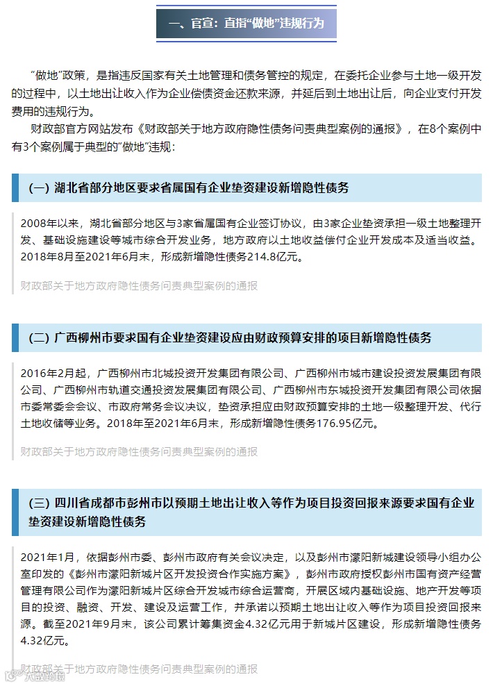 2023年11月6日,财政部官方网站发布《财政部关于地方政府隐性债务问责典型案例的通报》,在8个案例中有3个案例或涉及较为典型的“做地”模式。