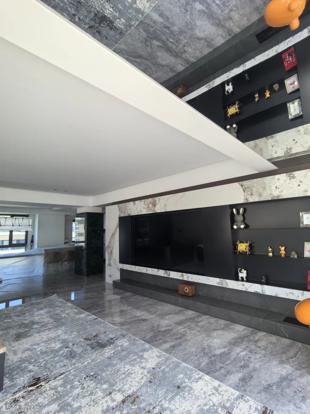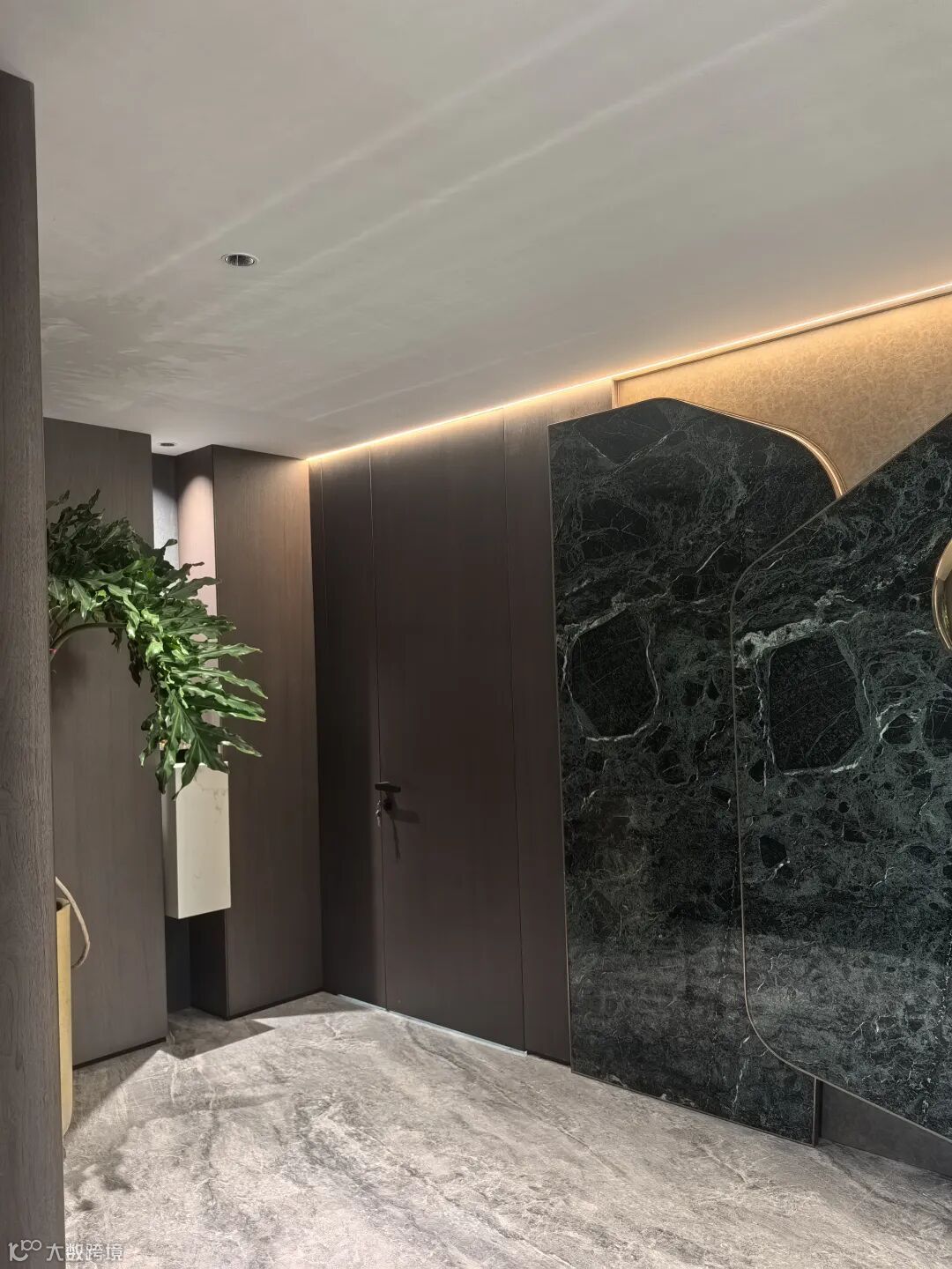 连接公共与私密空间的过道,是设计师巧思的过渡场域。这里的顶墙全部采用 TIXE( 泰科斯系列)的玛泰涂料,源自意大利 TIXE SRL 工厂的研发配方,玛泰涂料的耐磨抗污特性,完美适配过道高频使用的场景;而其细腻的哑光质地,与弧形木质墙面、墨绿色大理石装饰板自然融合,在嵌入式灯光的勾勒下,营造出静谧且高级的行进体验。