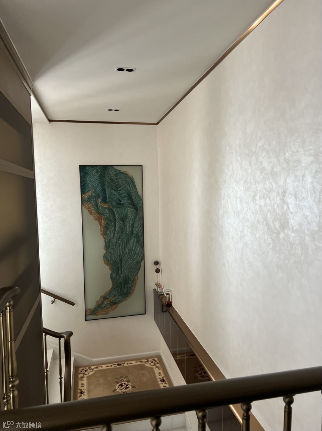 从一层的公共欢聚到二层的私密休憩,斯达丝绸艺术涂料不仅实现了空间氛围的自然过渡,更以统一的质感语言串联起整个复式结构。楼梯间的墙面作为上下层的连接纽带,同样采用斯达丝绸涂料装饰,光影在此交织,让楼梯不再是单纯的通行工具,而是成为空间美学的延伸。这种设计巧思,既展现了复式空间的灵动格局,也印证了斯达丝绸在大面积施工与多空间适配中的卓越表现——零色差、无接痕的浑然一体,让这座豪宅的每一处都保持着一致的高端质感。