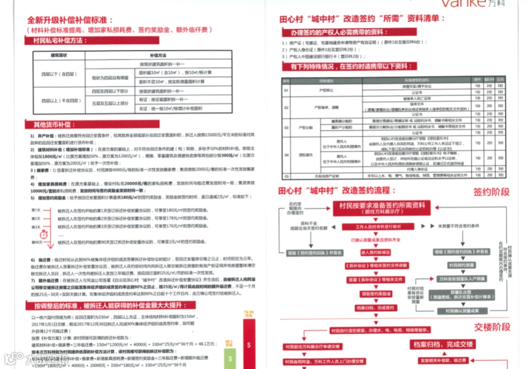 由地产行业巨头万科操刀的白云田心村,补偿方案也历经几个版本。由于田心村拆迁补偿方案是在2014年制定的,至今已有三年的跨度,考虑到物价上涨的因素,广州万科以保障村民利益为出发点,在原拆迁补偿方案的基础上提高了补偿标准,并增加相应的奖励金。这也意味着,根据拆迁补偿安置方案,除了复建回迁安置房外,村民还可获得建筑材料补偿、搬家费、临迁费、家具损耗费、奖励金等各项费用。