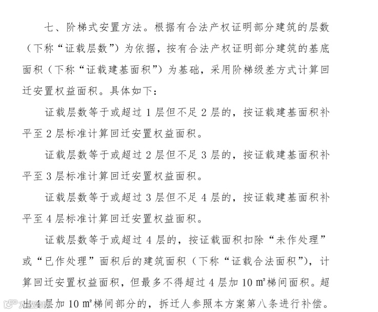 (1)房屋补偿:拆一补一,超过四层以上的只做材料补偿,允许购买权益面积。