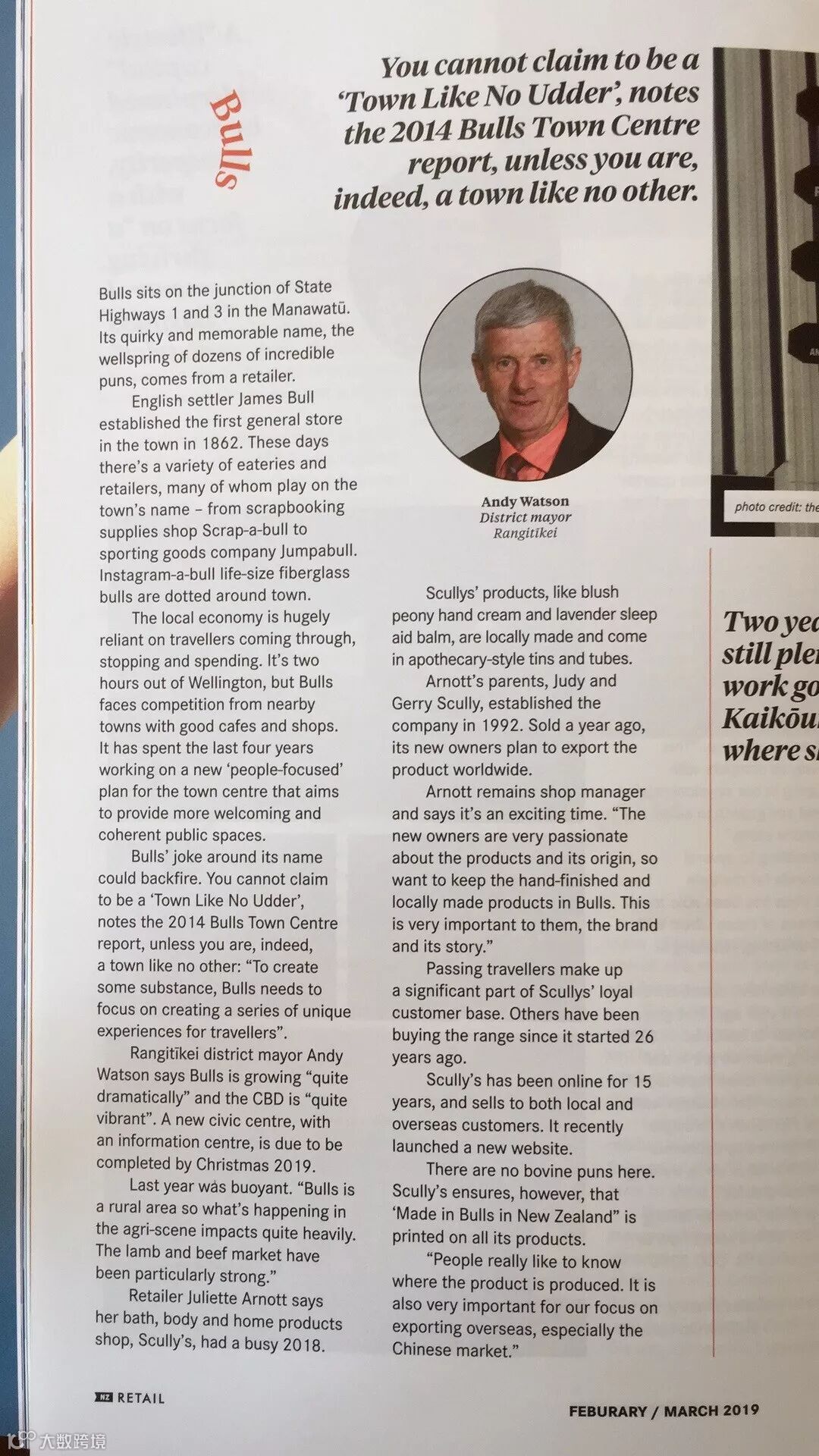 刚出版的2019年2月-3月New Zealand <Retail>新西兰“零售”杂志刊登了SCULLYS所在地区的市长所发表的讲述SCULLYS故事的文章。