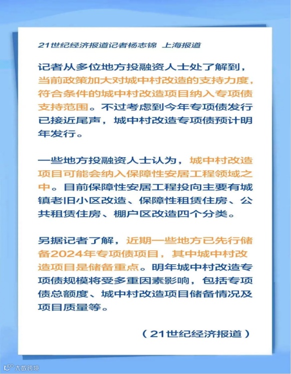 近日21世纪经济报道记者杨志锦了解到,当前政策加大对城中村改造的支持力度,符合条件的城中村改造项目纳入专项债支持范围。