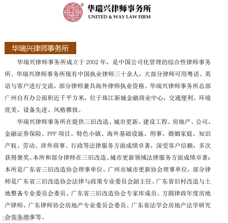 华瑞兴作为广州本地建设工程、房地产、PPP、城市更新专业公司化律所,多年来深耕细作,致力于创建房地产及建设工程全流程法律服务专业团队,打造房地产及建设工程法律服务、投融资和资源整合综合性平台。欢迎大家多交流合作!