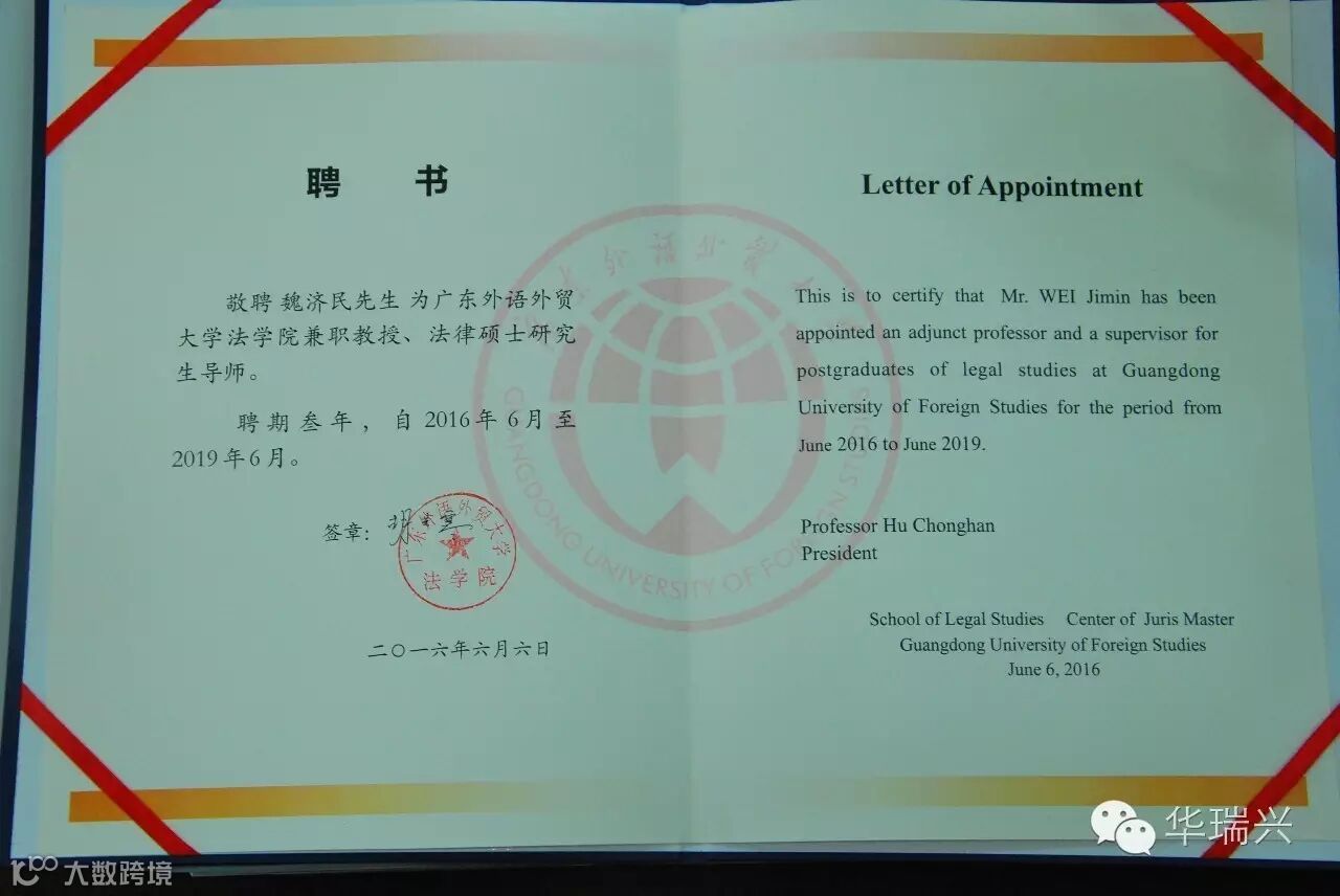 2016年6月8日,广东外语外贸大学法学院胡院长和王副院长莅临广东华瑞兴律师事务所,为魏济民律师颁发了法学院兼职教授、法律硕士研究生导师聘书。魏律师在房地产、建筑工程、PPP专业具有较高的造诣和丰富的实操经验。