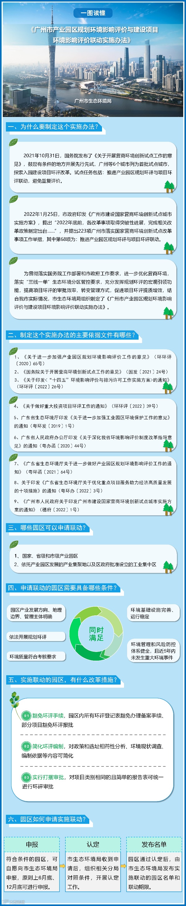 为进一步优化营商环境,深化“放管服”改革,落实营商环境创新试点工作要求,根据《国务院关于开展营商环境创新试点工作的意见》(国发〔2021〕24号)等有关规定,结合我市实际,我局制定了《广州市产业园区规划环境影响评价与建设项目环境影响评价联动实施办法》,现予印发实施。