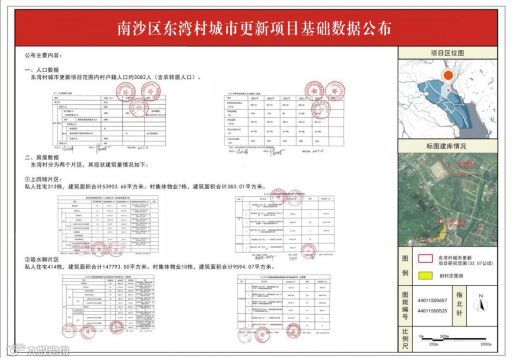 据南沙国规局发布的控规调整公示,东湾村项目研究范围面积约32.07公顷,改造范围内户籍人口3082人(含农转居人口),涉及上四倾、吸水脚两个片区。改造总建筑面积约211674平,包括村民私人住宅727栋,其中上四倾片区私人住宅313栋,建筑面积合计53903.65平方米;吸水脚片区414栋,建筑面积合计147793.50平方米。