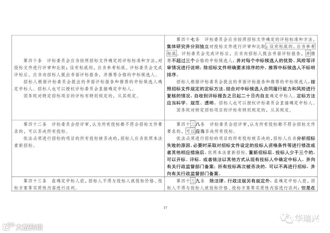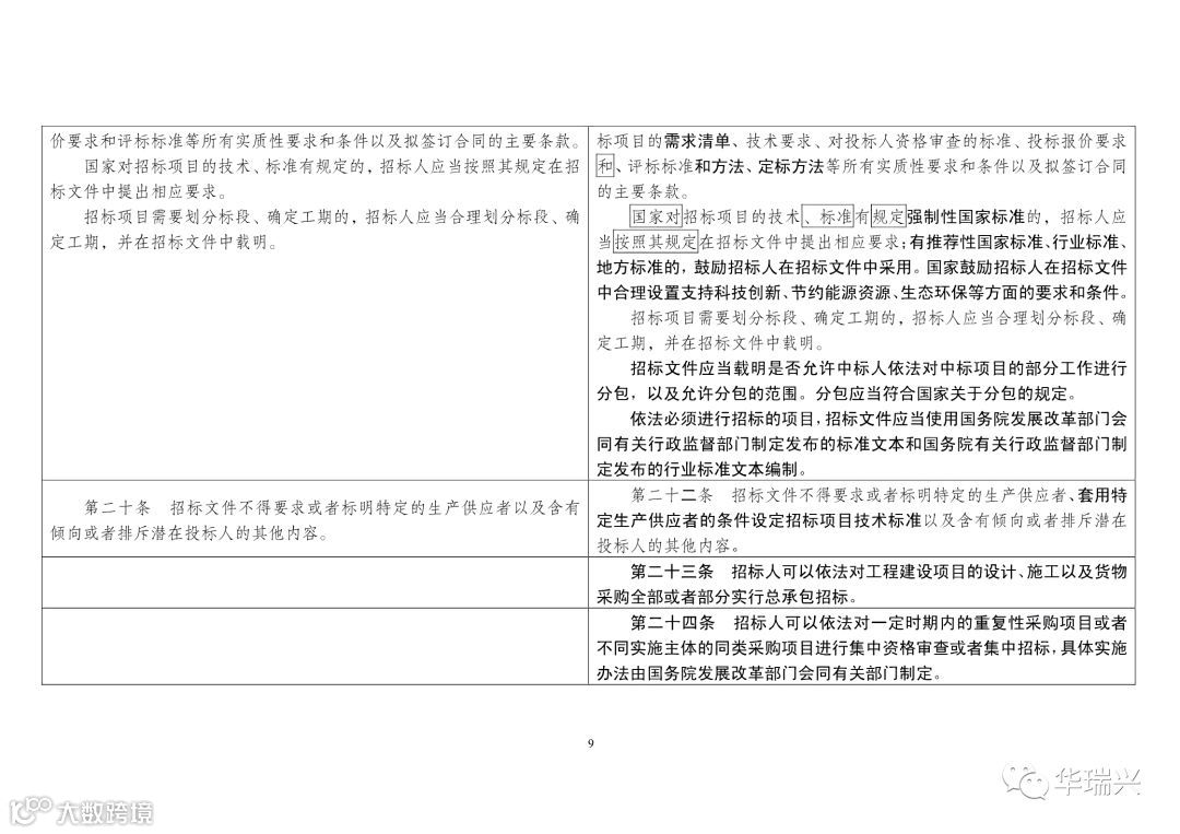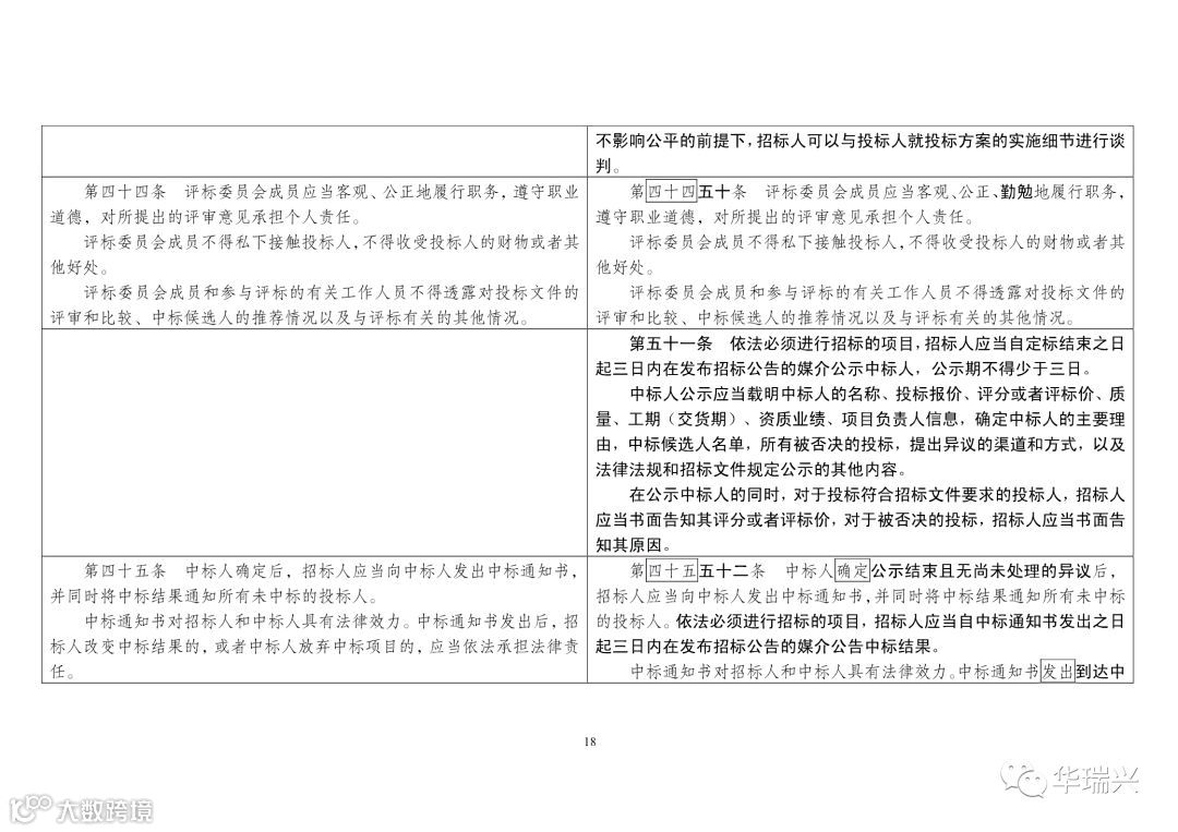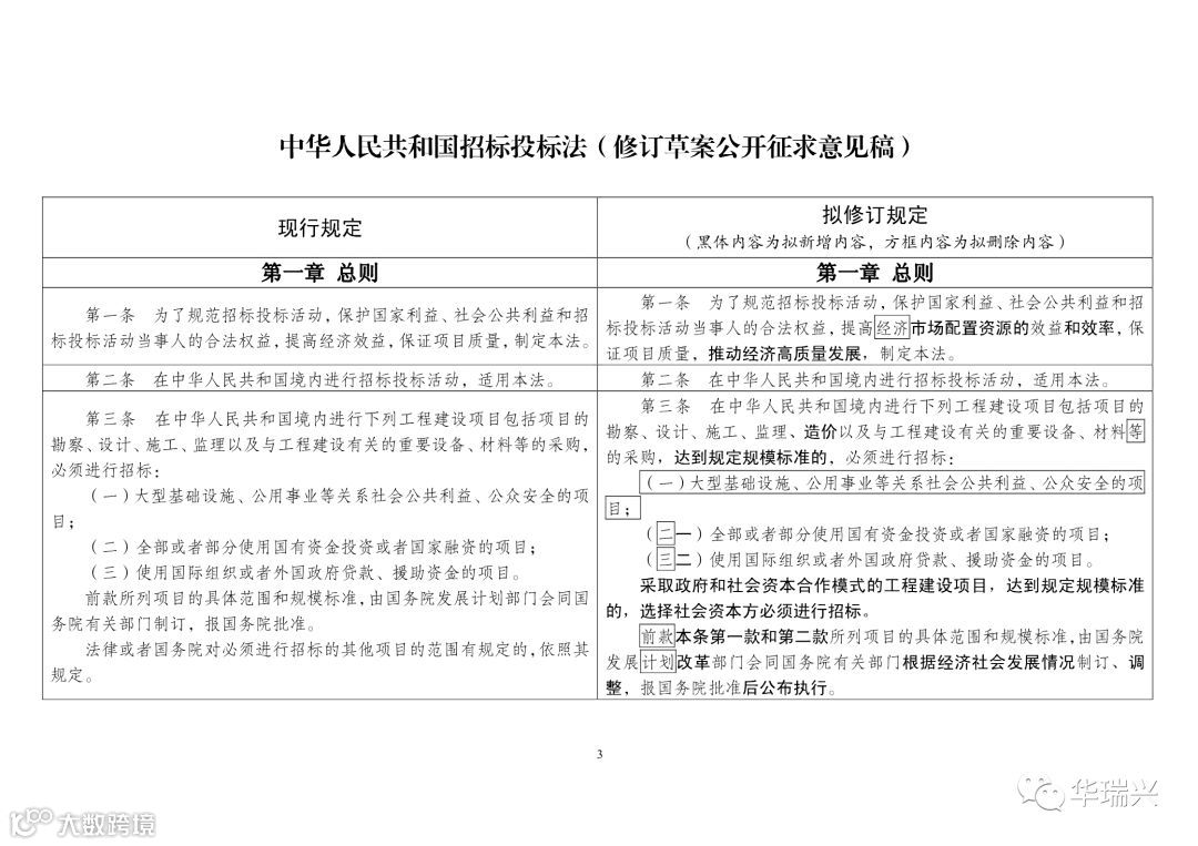 12月3日,国家发改委网站公布《中华人民共和国招标投标法(修订草案公开征求意见稿)》(以下简称《征求意见稿》)。《征求意见稿》共8章,94条,对现行《招标投标法》修改58条,增加28条,删除2条,维持8条不变。《征求意见稿》主要对以下八个方面进行了修订和完善。(一)推进招投标领域简政放权。(二)提高招投标公开透明度和规范化水平。(三)落实招标人自主权。(四)提高招投标效率。(五)解决低质低价中标问题。(六)充分发挥招投标促进高质量发展的政策功能。(七)为招投标实践发展提供法治保障。(八)加强和创新招投标监管。