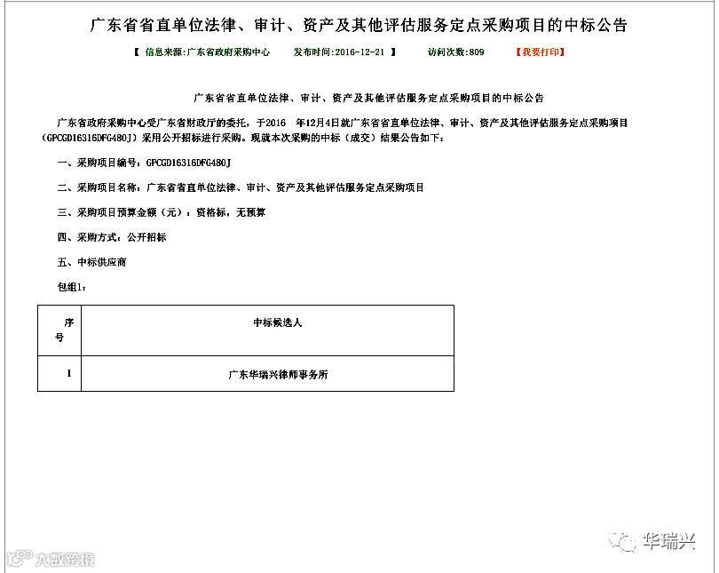 2016年12月4日,华瑞兴律师事务所参加“广东省省直单位法律、审计、资产及其他评估服务定点采购项目(子包1:律师事务所)”的公开招投标,经过评标委员会专家组的评审,于2016年12月21日成功中标该项目。